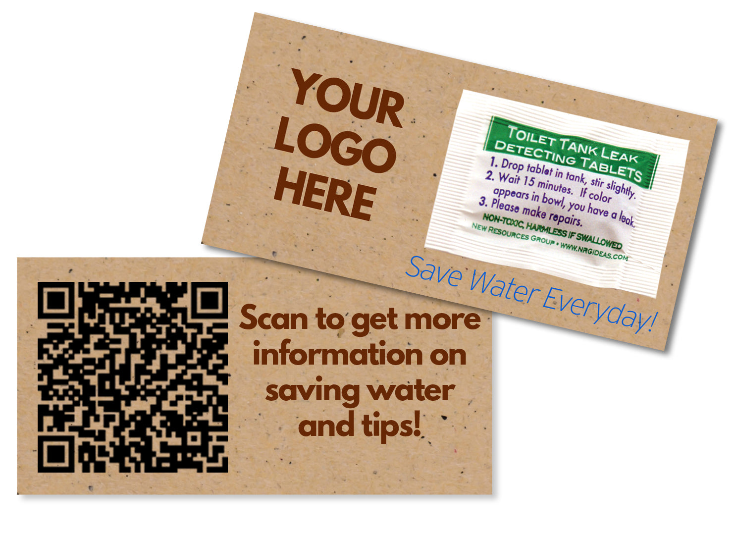 Custom Leak Detection Cards, Dye-Tabs on instruction card with logo and message. Door Hanger, Kids & Spanish styles available.