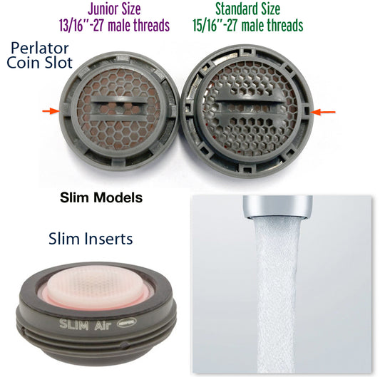 Aerators are the ends of faucets that give us the stream and filter in the kitchen and bathroom. Lower the flow (gpm – gallons per minute) the more you save. There are 3 common stream types, laminar which is a Crystal clear stream. Aerated which is most common, soft white stream. Multiple laminar, which is like a shower spray pattern. New Mikado stream spray design & Rain Shower styles now available.