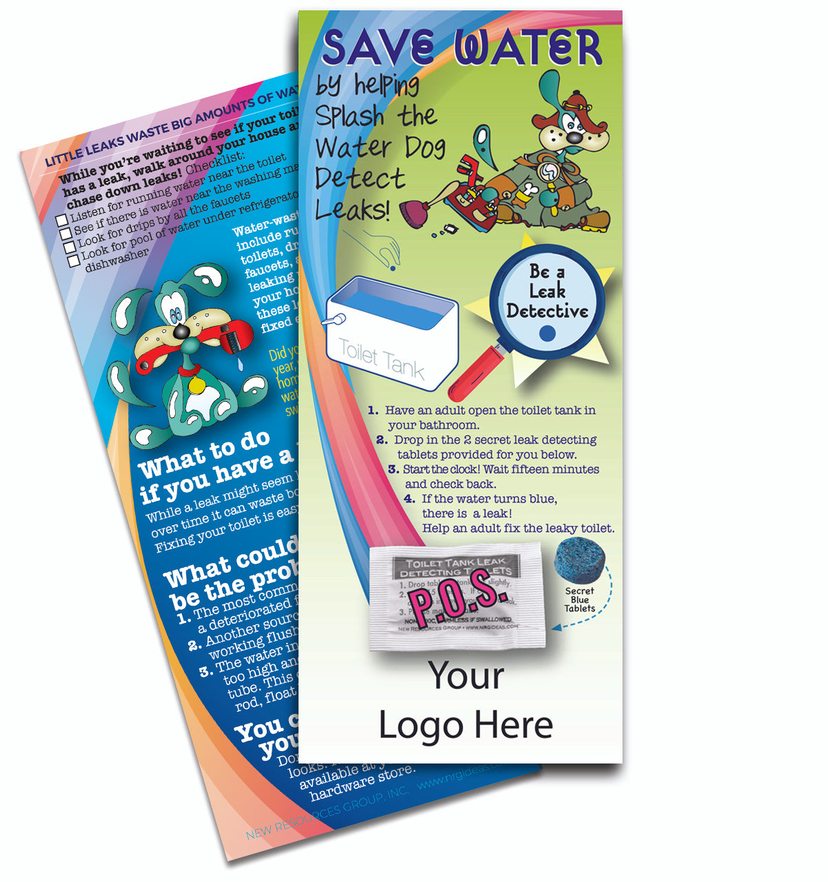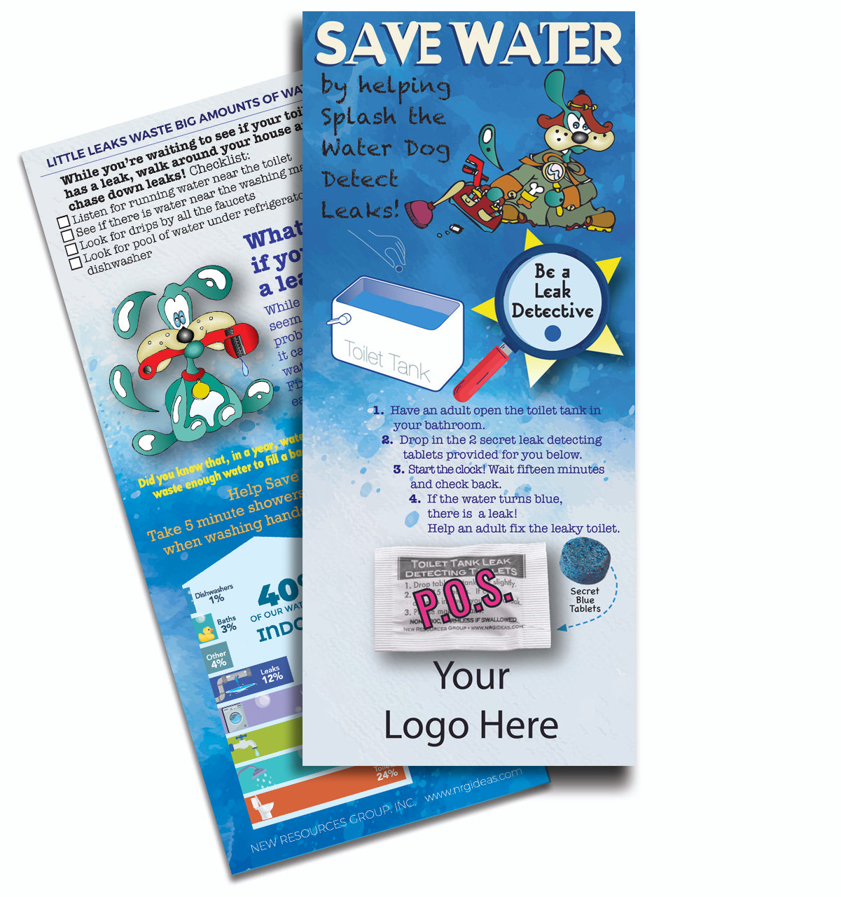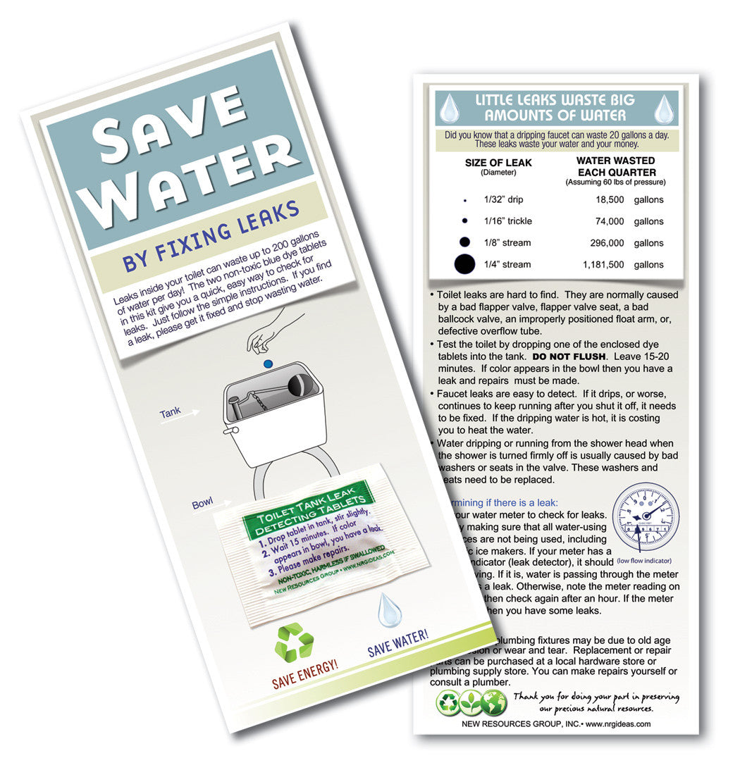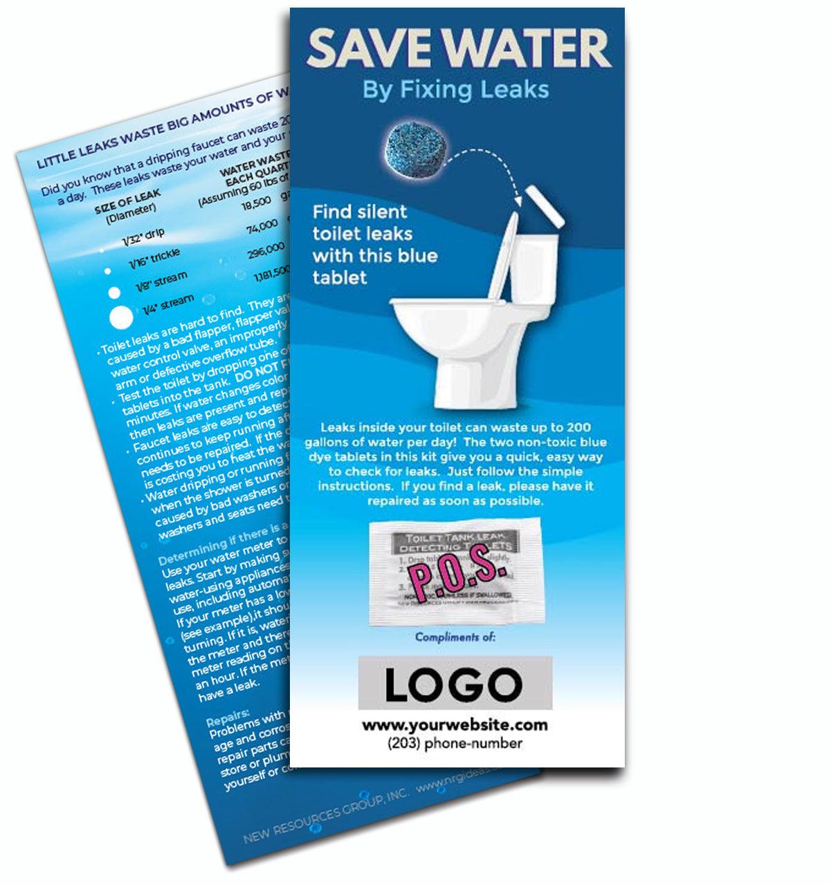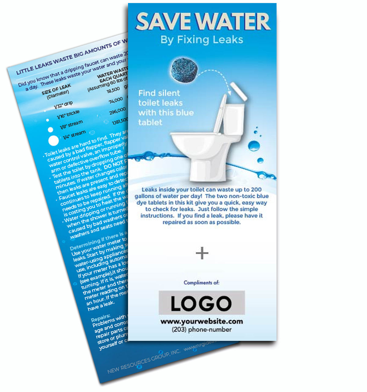 Custom instruction card with blue leak detecting tabs good for 2 tests. Choose your style card and upload your image / logo and message. This simple water saving measure is the basic step with saving water in the home.