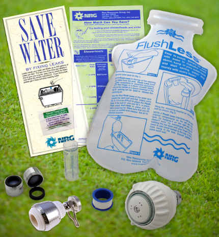 The complete Indoor Kitchen & Bathroom ECO-KIT. Save water indoors with this useful kit of conservation tools. Help detect leaks and find out how to save. Indoor water conservation kit with best products on the market: 2.0 gpm Massage Pro white shower head, 2.0 gpm swivel spray kitchen aerator, 2 bath aerators that are 1.0 gpm , a heavy gauge toilet displacement bag and leak detecting tablets, a flow gauge bag, drip vial and teflon tape with installation instructions. 9 piece earth friendly water conservation kit retro fit the home complete with instructions.