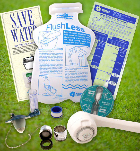 The complete Indoor Premium Bathroom ECO-KIT. Save water indoors with this useful kit of conservation tools. Help detect leaks and find out how to save. Indoor water conservation kit with best products on the market: 2.0 gpm Massage Pro white hand held shower head 2.0 (with hose), 2 bath aerators that are 1.0 gpm , a heavy gauge toilet displacement bag and leak detecting tablets, a flow gauge bag, Five minute shower timer,1 frugal flush replacement flapper, Flow gauge bag, drip vial and teflon tape with installation instructions. 10 piece earth friendly bathroom water conservation kit retro fit the home complete with instructions.